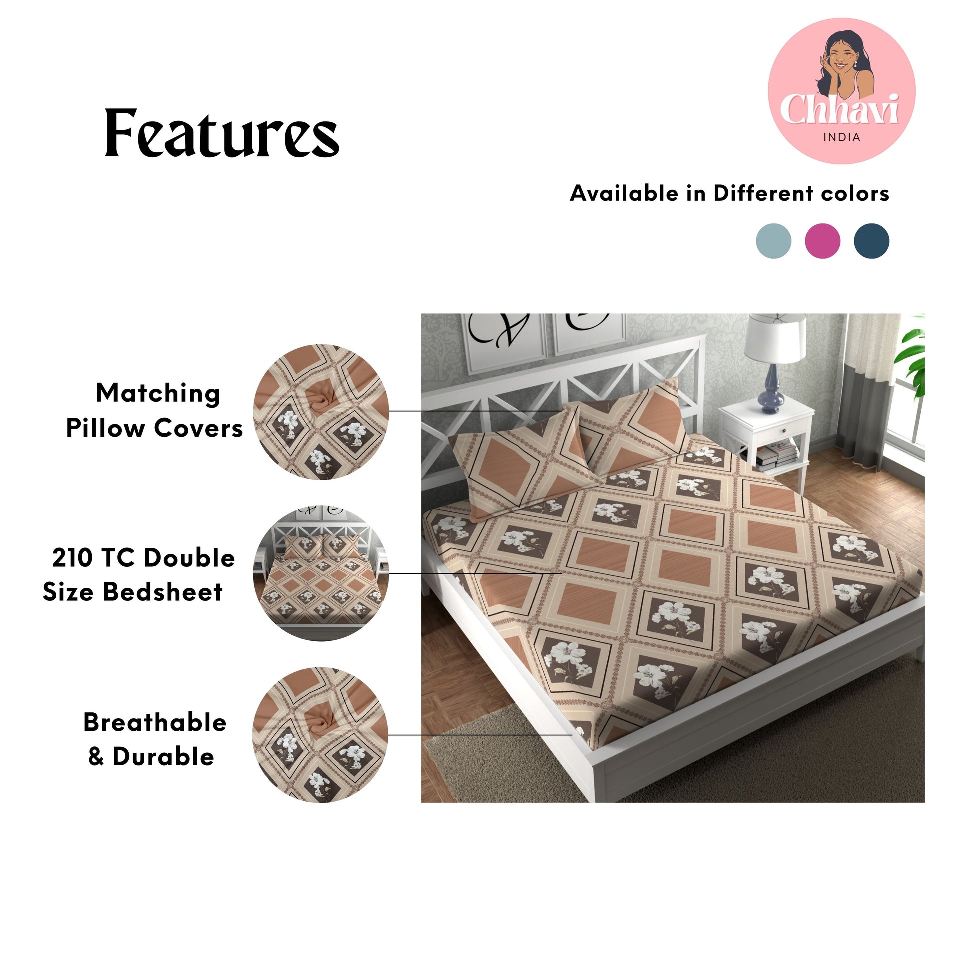 Give your bedroom a stylish makeover with this beautiful Double Bedsheet from CHHAVI INDIA Inspired by nature, the bedsheet is 100% premium quality microfiber that is soft to touch and comfortable on the skin. It delivers maximum relaxation and comfort while sleeping. Suitable for all seasons and a perfect addition to your bedroom linen!
